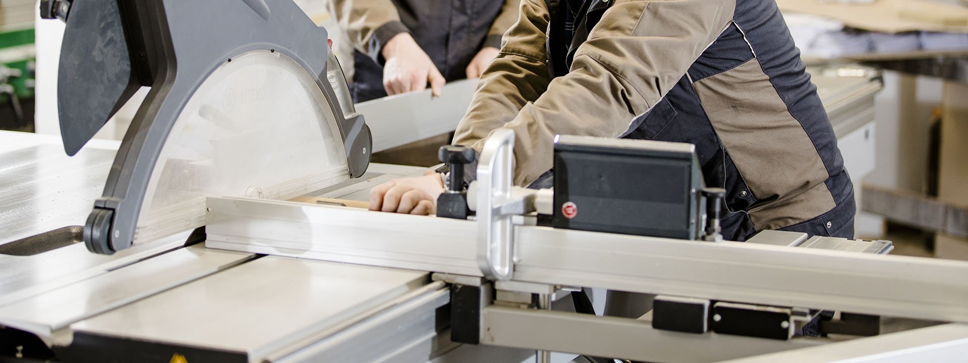 • Mehrere Tischler arbeiten gemeinsam an einer Formatkreissäge – präzise Holzbearbeitung in der Werkstatt